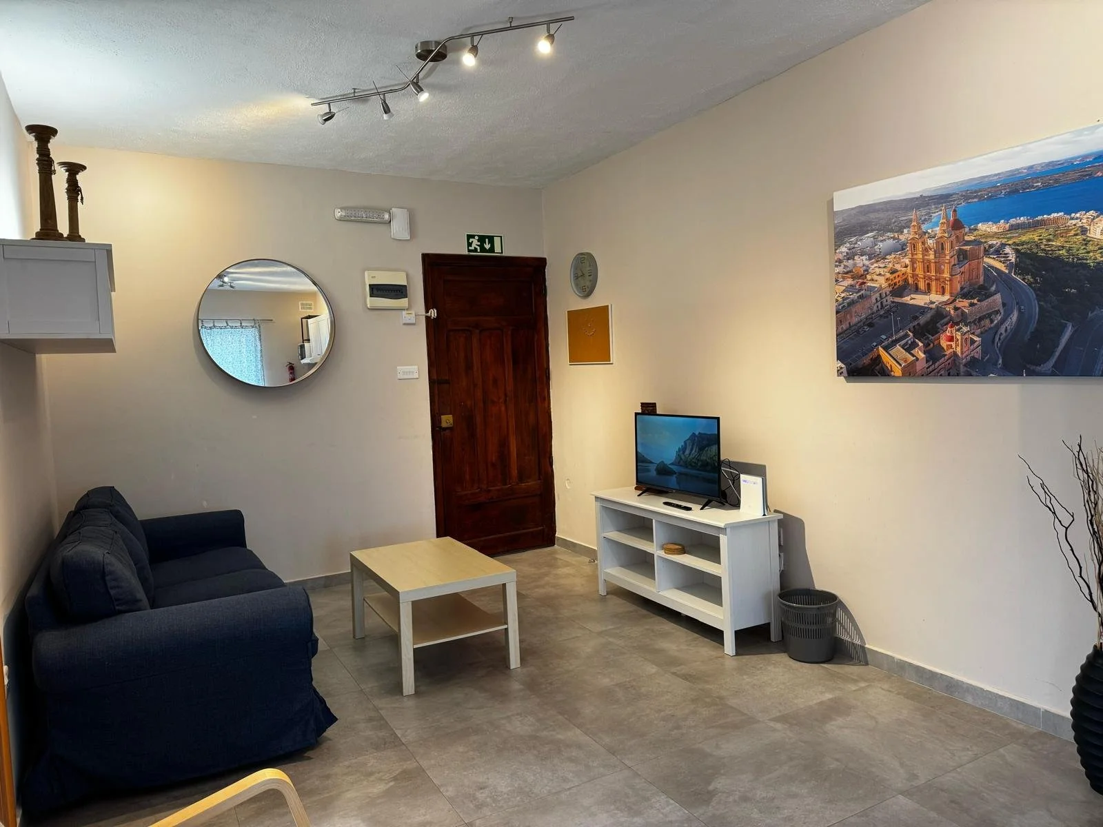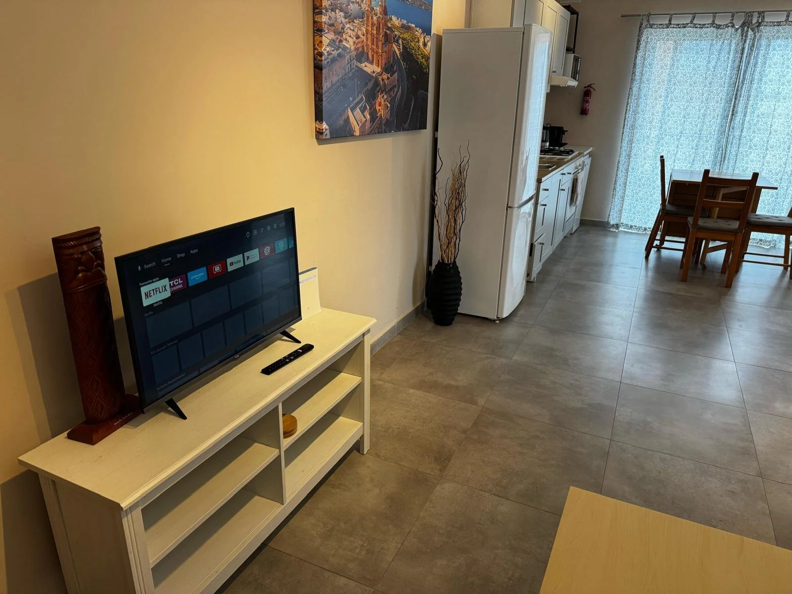 The open-plan kitchen, dining, and living areas create a serene and inviting atmosphere, ideal for returning after a day spent appreciating the stunning landscapes of Malta's northern coast. This space features a fully equipped kitchen including a dishwasher, microwave, full-size fridge-freezer, oven, and gas stove, allowing for both comfort and practicality. The dining area, complete with a table and chairs, facilitates a smooth transition from meal preparation to enjoying shared moments with family and friends in a warm environment. Meanwhile, the living area, furnished with a 3-seater sofa and TV, serves as a perfect retreat to relax and strategize for your next island exploration.